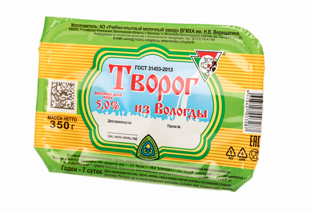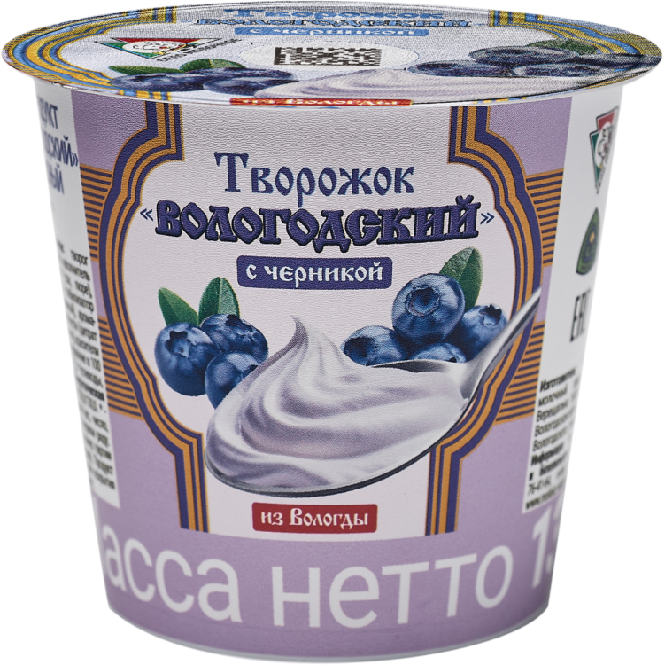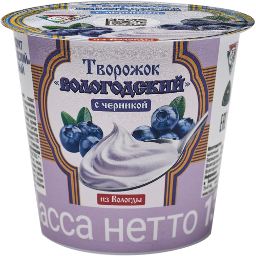 ТВОРОЖНЫЙ ПРОДУКТ "ТВОРОЖОК ВОЛОГОДСКИЙ" "ЧЕРНИКА" Объем масса 130 г Жирность 5% В упаковке 6 шт Срок годности 7 суток